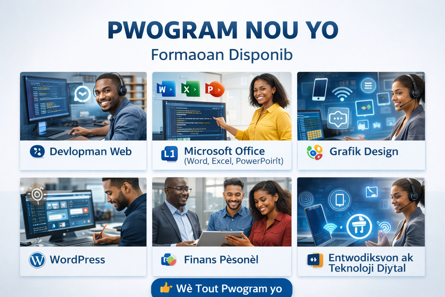 Nou ofri fòmasyon pratik, klè, epi adapte ak reyalite aktyèl la pou ede chak etidyan devlope konpetans solid ak konfyans nan tèt yo.